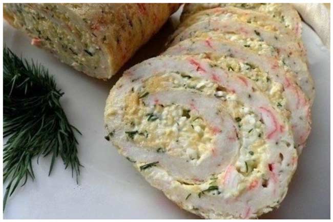Трем в миску 200 грамм твердого сыра, 200 грамм крабовых палочек, добавляем 5 яиц, 150 грамм майонеза, 5 столовых ложек муки, каплю молока, чтобы получилась консистенция густой сметаны. На противен выложите рукав для запекания (разрежьте его, чтобы свешивалось по краям), смажьте растительным маслом — вылейте на него смесь и в духовку на 5-10 минут (следите, готовится очень быстро, пойдут сверху пузыри, доставайте). Пока делается основа, включите фантазию — внутрь можете положить что угодно — сыр, перетертый с чесноком, фарш с зеленью, вареные яйца, маслины и т.д. Достаете вашу массу, выкладываете сверху «замазку» и сворачиваете рулет. Оставляете до полного остывания. Если кладете фарш, то поставьте в духовку еще минут на 10.