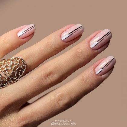 Правило то же, что и с одеждой: продольные полосы «вытягивают», поперечные — расширяют. Маникюр подойдет для ногтей средней длины (выступающая часть ногтя 1-2 мм). Для коротких ноготков лучше подобрать другой вариант. Линии могут быть нарисованы или сделаны с помощью клейкой ленты для дизайна.