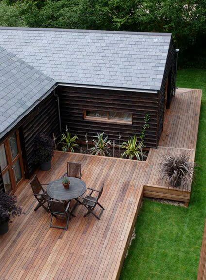 На открытой террасе можно располагать предметы мебели (которую можно сделать самостоятельно — 10 Простых проектов садовых диванов, 20 Примеров простой мебели из бетона или 77 Идей использования строительных поддонов) места для трапез и даже детские игровые зоны. Но в таких случаях важно позаботиться о защите от солнечных лучей и предусмотреть возможность натягивания тента или использования садовых зонтов. На закрытых террасах проблем с солнцем у вас уже не будет. Если вы хотите сделать из своего сада нечто уникальное, тогда взгляните на 30 элементов, которые способны перевоплотить сад в райское место.