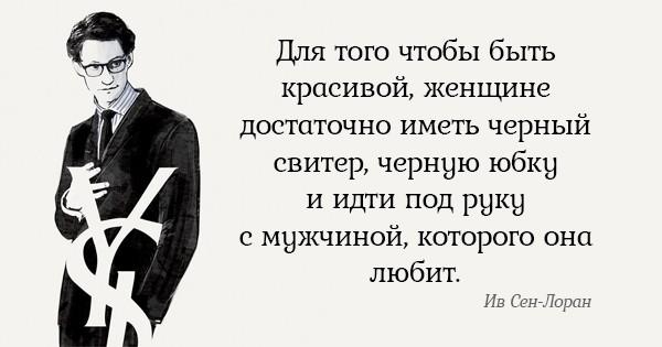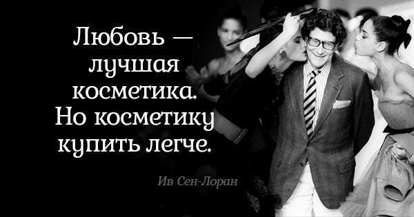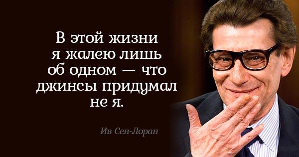 - «Самая лучшая одежда для женщины — это объятия любящего ее мужчины. Но для тех, кто лишен такого счастья, есть я!» Сен-Лоран стал первым нарциссом в мире моды: этот человек умел любить себя. Выпустив линию духов, названных в честь себя, он снялся для рекламы совершенно голый. Очень провокационный шаг в 1971 году…Ив убедительно советовал всем женщинам не искать счастья в любви, которая имеет свойство проходить и часто бывает несчастной. Намного проще регулярно радовать себя новой одеждой и косметикой, а любовь получать как приятный бонус.