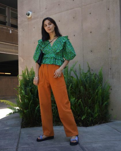 Спортивные «прямоугольники» с чистой совестью могут позволить себе оверсайз и объемные декоративные элементы в районе груди и бедер. Брюки с защипами, а также блузы с воланами и рукавами-буфами подчеркнут талию, хоть явных акцентов на ней и нет. Хитрость в том, что такие фасоны создают равномерный объем в районе плеч и бедер, из-за чего центральная часть силуэта кажется тоньше и изящнее.