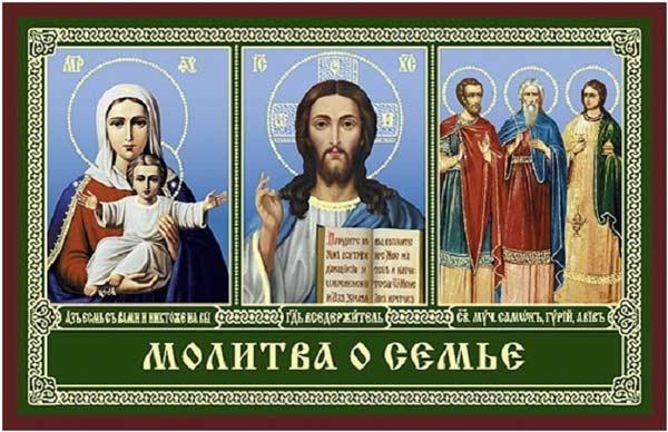 «Владычице Преблагословенная, возьми под Свой покров семью мою, всели в сердца супруга моего (супруги моей) и чад наших мир, любовь и непрекословие всему доброму. Не допусти никого из семьи моей до разлуки и тяжкаго расставания, до неисцельных болезней и преждевременныя и внезапныя смерти.