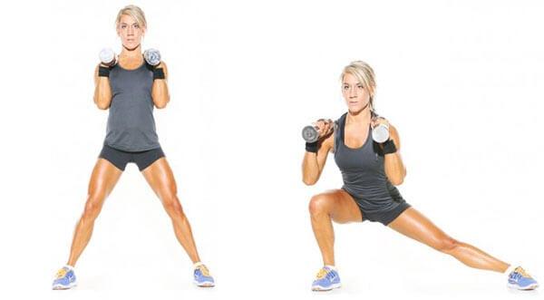 Почти то же самое, что и обычный выпад ногой назад с одновременным приседом, только в этом случае нога движется по диагонали, наискосок, траектория получается шире, что очень помогает при квадратной попе. Потом приставляем ногу назад, напрягая мускулы передней ноги. С помощью этого движения одновременно работают разные группы мышц.