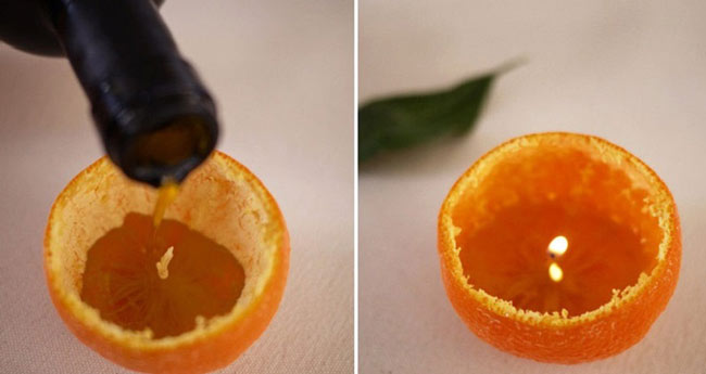 Кстати, из половинок апельсина можно сделать ароматические свечи своими руками. Если у вас нет шнурка для фитиля, вполне подойдет хвостик, который остается после чистки фрукта. Наливаем в половинки апельсина оливковое масло, поджигаем фитиль и наслаждаемся приятным ароматом.