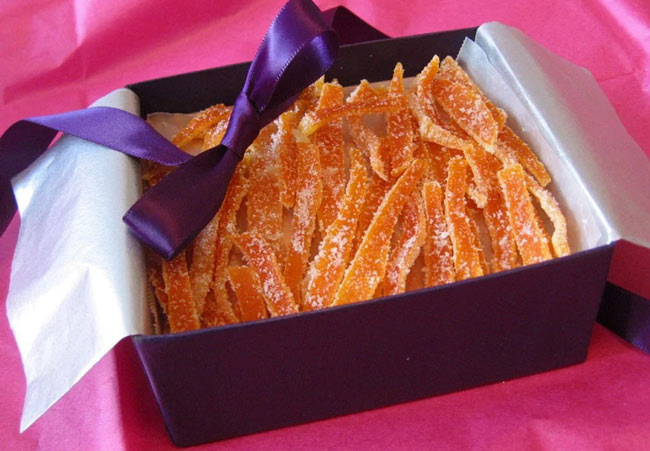 А знаете ли вы, как приготовить апельсиновые цукаты? Нет ничего сложного: нарезаем апельсиновую кожуру полосками и замачиваем на сутки в воде (воду необходимо периодически менять). Заливаем наши корки свежей водой и варим около получаса. Затем добавляем сахарный сироп и провариваем до прозрачности корок. Сливаем воду, а готовые цукаты просушиваем. Наш ароматный десерт к чаю готов!