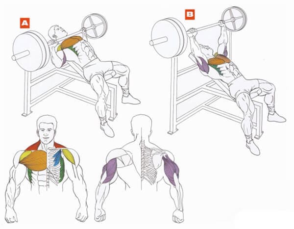 Теперь расскажу, почему именно наклонный жим, так как нижняя часть груди, работает в упражнениях на трицепс (отжимания на брусьях и отжимания от скамьи), то наша задача прокачать самую эффектную часть грудных мышц – это среднюю и верхнюю часть, которые отлично задействуются в жиме штанги на наклонной скамье.