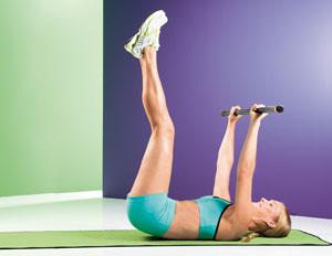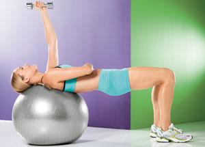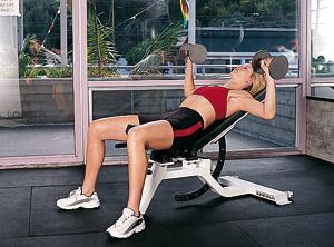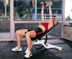 Сев на край гимнастической скамьи, расположенной под углом 30º, возьмите гантели и положите их сверху на бедра. Начните медленно опускаться на скамью, ноги должны быть согнуты под прямым углом. Потом, соединив лопатки и напрягая мышцы пресса, согните руки, подняв гантели к плечам. Разогните руки над грудью. Следите, чтобы запястья располагались ровно над плечами, ладони должны смотреть вперед. После этого медленно сгибая локти, нужно развести их в стороны, соблюдая при этом прямой угол и стараясь, чтобы руки выше локтей были на уровне плеч. Напрягите мышцы груди и постепенно выпрямите руки. Вес гантелей: от 1,5-4 кг.