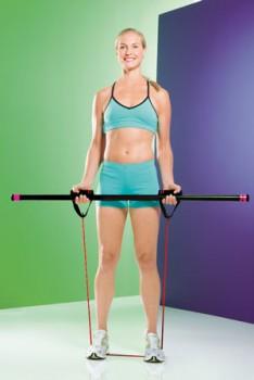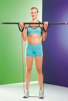 Встаньте прямо, руки опущены вдоль тела ладонями вниз, в руках штанга или бодибар хватом сверху, ноги на ширине плеч, колени слегка согнуты. Сначала поднимите штангу к груди, а затем выпрямите руки над головой и сделайте приседание, слегка наклонив корпус вперед. Следите, чтобы мышцы пресса были напряжены, лопатки соединены, спина не прогибалась. Выпрямите колени. Выполнив повторы, опустите штангу на уровень груди. Вес штанги: от 2-12 кг.