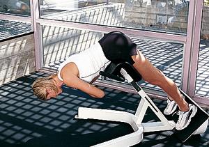 Для выполнения упражнения понадобится тренажер для мышц низа спины, верхний край упора должен быть расположен под тазобедренным суставом. Исходное положение: стоя на подставках для ног, бедра упираются на упор, руки на груди, мышцы пресса напряжены. Отведите плечи назад и, наклонитесь назад, держа спину прямой. С помощью мышц ягодиц и задней поверхности бедра вернитесь в исходное положение. Это упражнение также можно выполнять с отягощением 5 кг, использую прижатый к груди «блин».