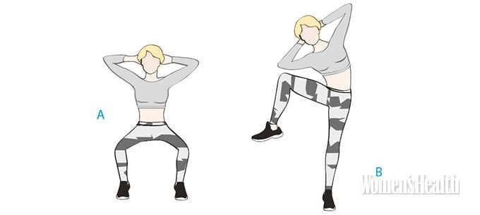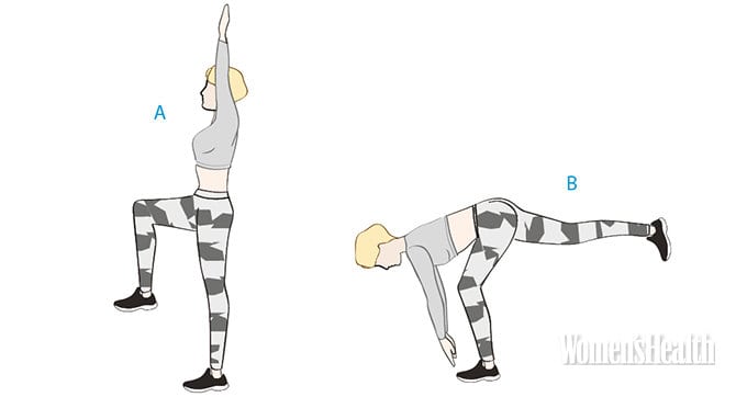 Подними руки над головой, а правое колено – до параллели бедра с полом (A).