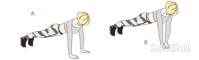 Встань в планку на прямых руках: руки на ширине плеч, кисти под плечевыми суставами. Напряги ягодицы и пресс (A).