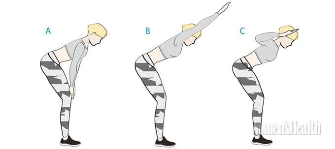 Наклонись вперед, чтобы коснуться руками стопы, одновременно с этим вытягивая назад правую ногу (не обязательно идеально прямую) (B).