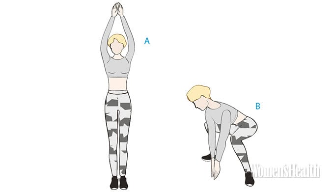 Развернись на 45 градусов, шагнув правой ногой так, чтобы стопы были под прямым углом друг к другу. Сядь в глубокий присед, одновременно опуская руки вниз через стороны: в конечной точке коснись ими пола (B). Вернись в положение A – это 1 повтор.