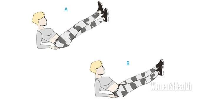 Ляг на спину, обопрись на предплечья и подними прямые ноги под углом 45 градусов к полу. Скрести их так, чтобы наверху оказалась правая (A).