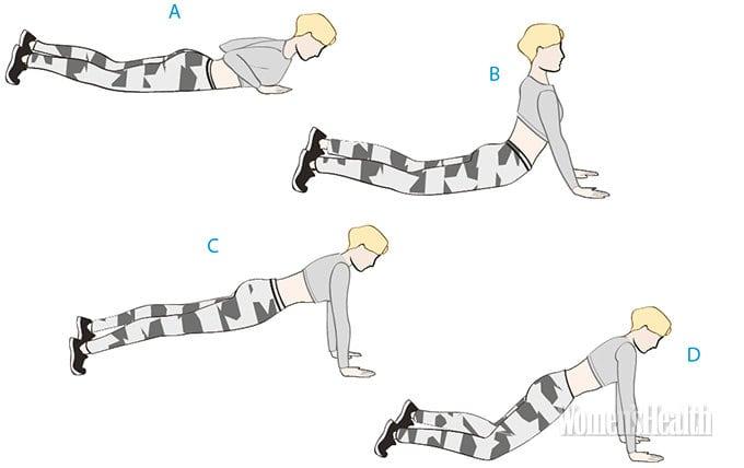 Снова верни руки в положение B, а потом опусти к коленям – в C. Это 1 повтор. Сделай все 50, не разгибая спины.