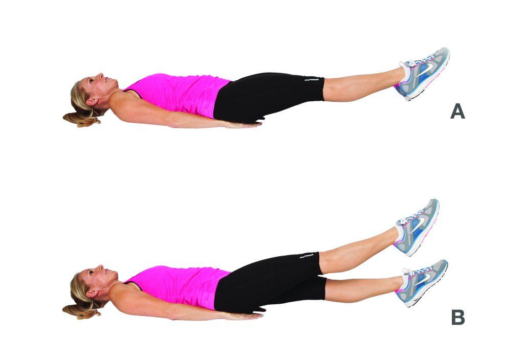 - Подъем ног лежа. Ложимся на гимнастический коврик, исходное положение, как при обратных скручиваниях, но нужно поднимать ноги по очереди под углом в 45 градусов.