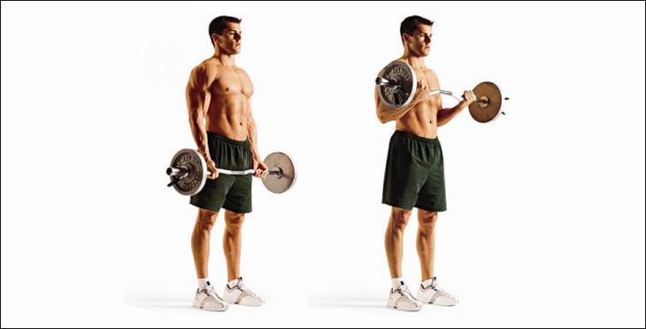 - Подъем штанги или гантелей на бицепс – 3-4 подхода по 6-12 повторений.