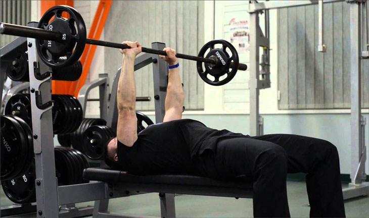 - Жим штанги лежа – 3-4 подхода по 6-12 повторений.