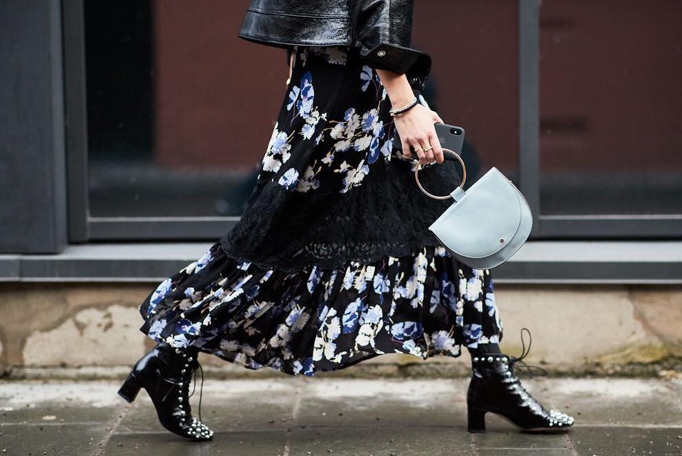 Для более нетривиального стиля советуем дополнить летящее платье в цветочек грубой моделью сапог на низком ходу и ультрамодной косухой. Не забудьте и про макияж – яркие губы добавят дополнительную изюминку в этот и без того нескучный образ.