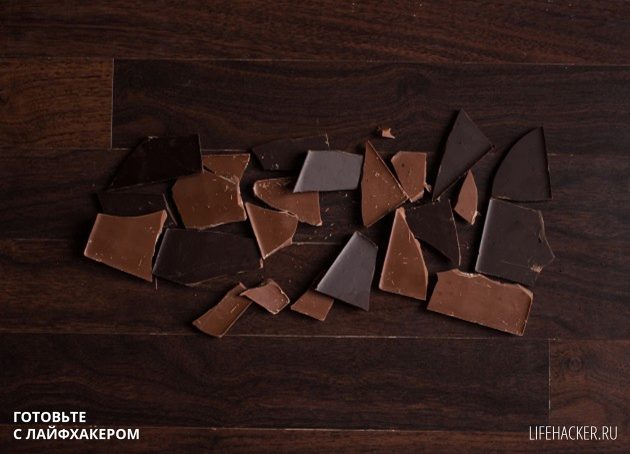 Сперва подогрейте 150 мл молока, уберите его с огня и приготовьте шоколадный ганаш, добавив к молоку кусочки шоколада и, помешивая, растопив их.
