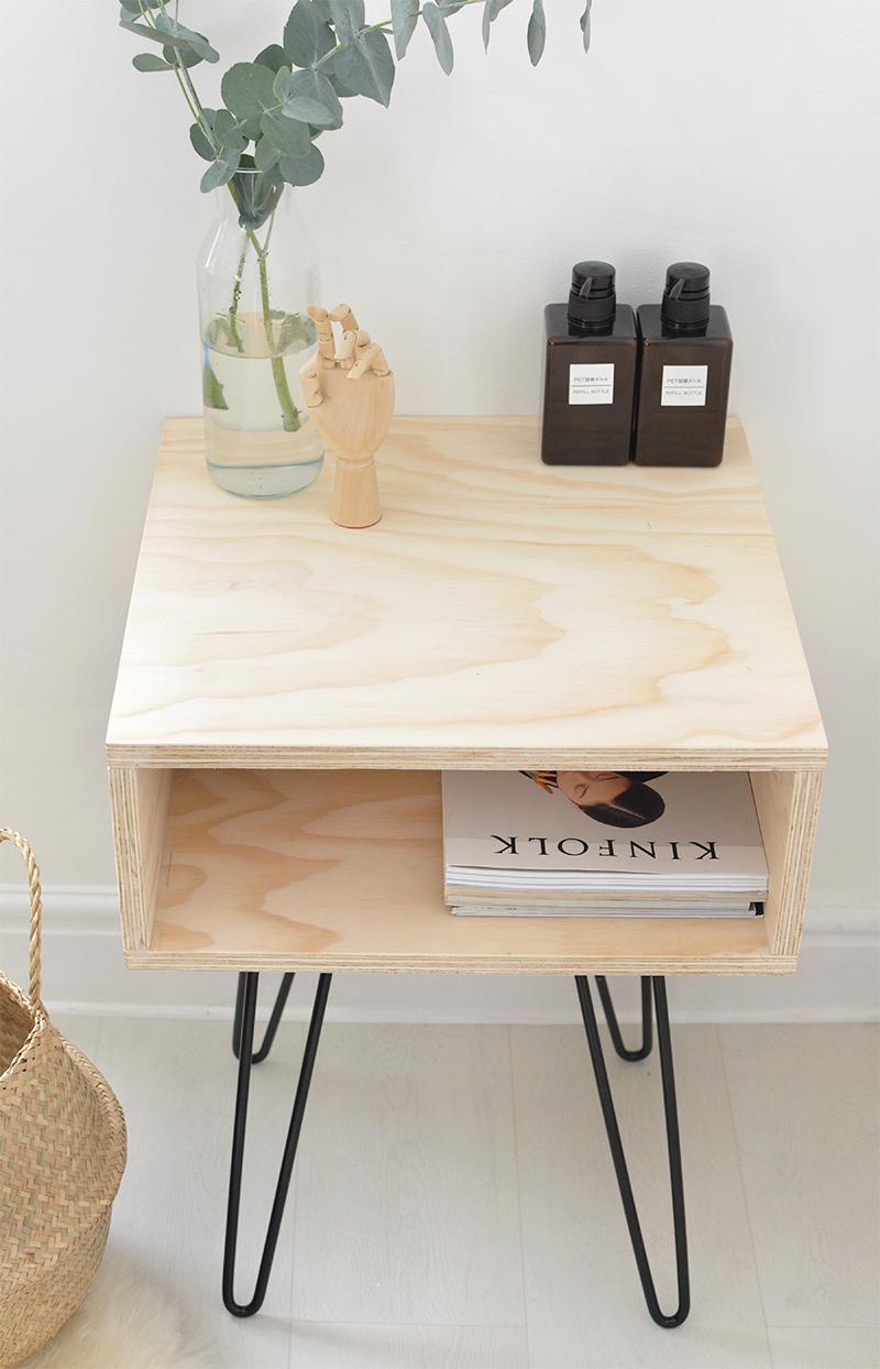 Стиль Mid-century modern и подобная мебель приобретает все большую популярность в настоящее время, так что давайте попробуем самостоятельно сделать тумбочку из фанеры. Вам понадобится лист фанеры, 4 ножки, клей для дерева, отвертка. Для того, чтобы сделать тело тумбочке вам потребуется 4 куска фанеры или сосновых досок. Размер фанеры для данной тумбочки 15 х 45 см (x2) для боковых частей и 45 х 45 см (x2) для верхней и нижней части. Чтобы прикрепить боковые панели к нижней применяется клей для дерева. По желанию, фанеру можно покрыть прозрачным лаком. Прикручиваем ножки и вуаля!