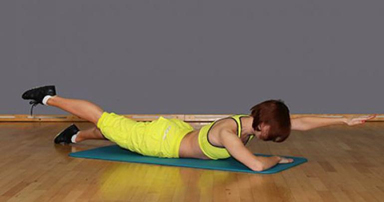 - Упражнение 3. Лечь на живот, плотно прижавшись к полу тазом. Правая рука согнута, подложена под лоб, левая вытянута вперед. Одновременно отрывать от пола правую руку и левую ногу. Через 30 секунд отдохнуть 5 секунд и повторить то же самое с противоположной стороной.