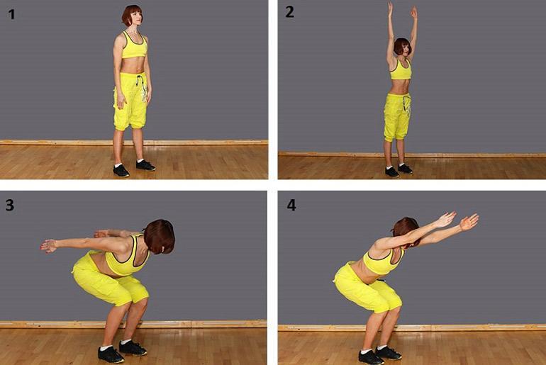 - Упражнение 1. Встать, расположив ноги на ширине плеч. Руки поднять, не сгибая, свести лопатки. Свой вес переместить на пятки, чуть-чуть согнуть колени и с прямой спиной податься туловищем вперед. Руки завести за голову и переместить вперед.