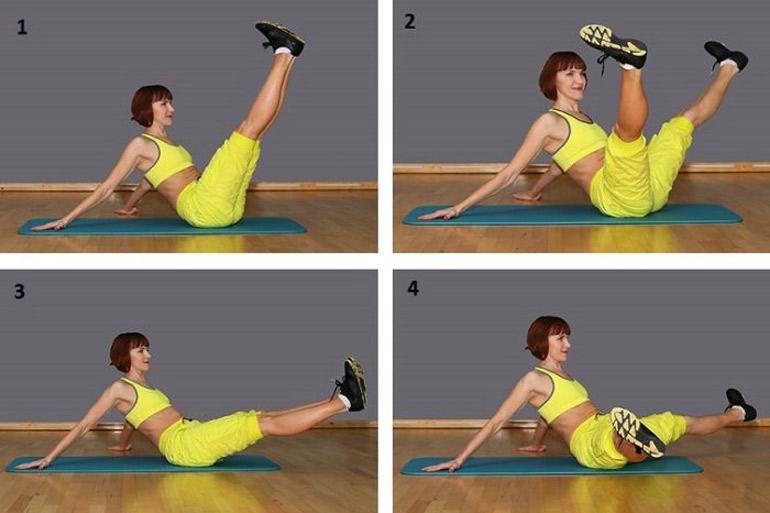 - Упражнение 1. Лечь на спину, свести согнутые ноги вместе, стопы прижать к полу. Руки уложить на внутреннюю поверхность бедер и развести локти в стороны по направлению вверх. Неспеша оторвать голову от пола и опустить ее так, чтобы нос смотрел на грудную клетку. Максимально округлив плечи и шею, вытянуть руки вдоль туловища параллельно полу и медленно на небольшом расстоянии подвигать руками вперед-назад.
