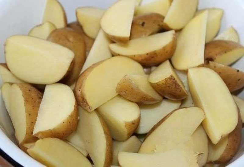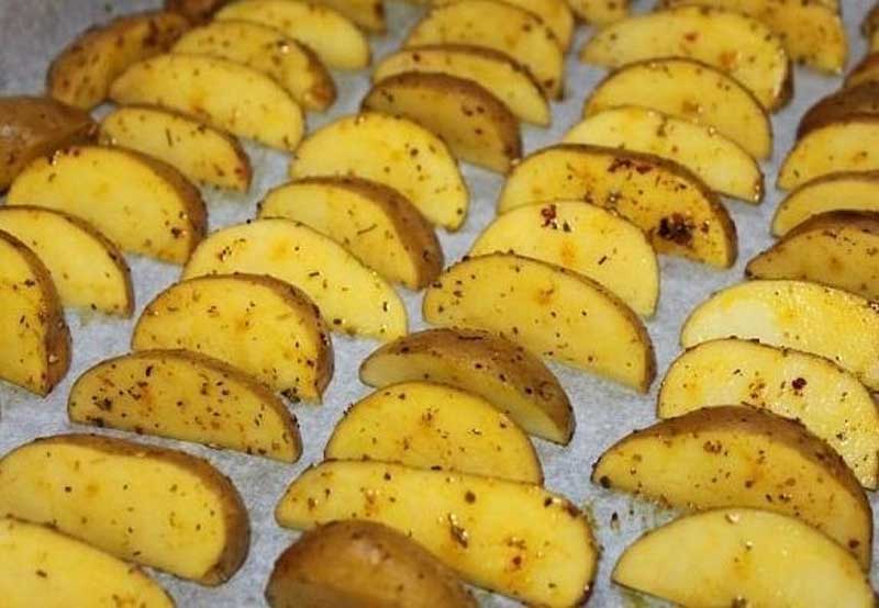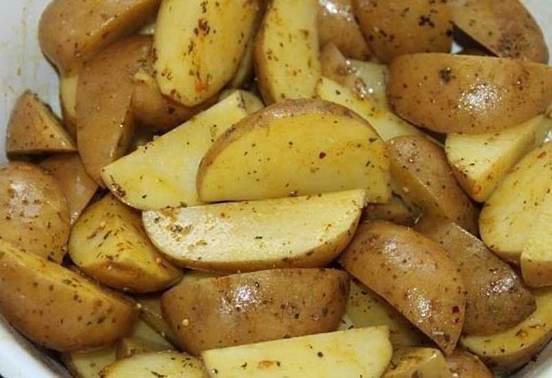 Очень важно хорошо промыть картофель под проточной водой, так как готовится он с кожурой. Режем картофель на дольки. Если плод крупный – на шесть частей, если небольшой – на четыре. Смешиваем специи: паприка придает картофелю небольшую сладость, прованские травы — непередаваемый аромат, а куркума – приятный золотистый цвет. Добавляем к специям масло. Можно использовать как подсолнечное, так и оливковое. Перемешиваем картофель со специями и маслом, солим.