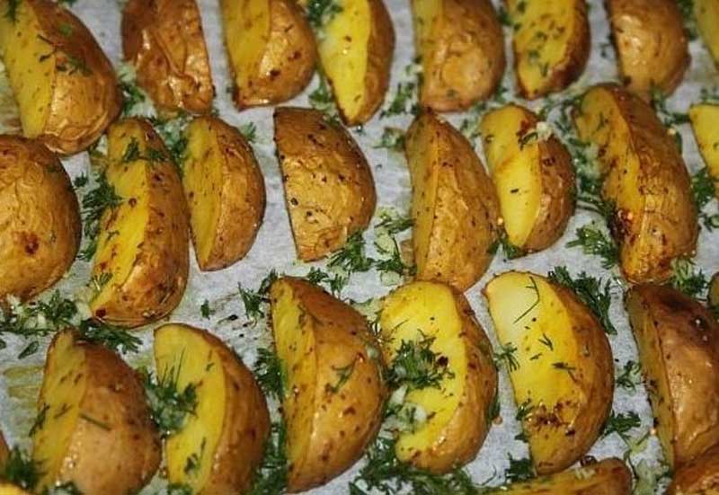 Примерно за 5 минут до конца посыпаем смесью укропа и чеснока картофель сверху. За это время чеснок не успевает сгореть, но придает картошке приятный чесночный привкус и остроту.