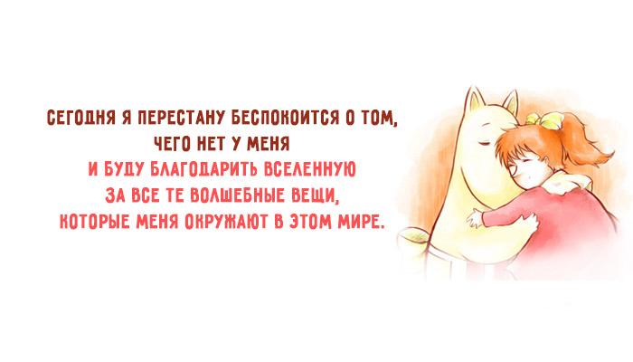 Я сотворю что-нибудь необычное и доброе для совершенно незнакомого мне человека. И подарю самый искренний комплимент тому, кто почему-то грустит. Я скажу ребенку, что он — совершенно особенный человечек. А той единственной, которую люблю — как сильно ее люблю и как же много она(-он) значит в моей жизни. Сегодня я перестану беспокоится о том, чего нет у меня и буду благодарить Вселенную за все те волшебные вещи, которые меня окружают в этом мире. Я знаю и помню, что беспокойство — это всего лишь пустая трата драгоценного времени. Моя вера в мои собственные силы и провидение приведут меня к моим целям.