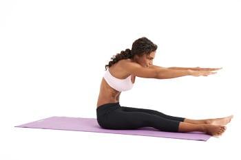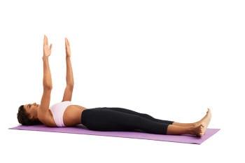 Нужно лечь на спину, руки выпрямить над головой, повернув ладони вверх. Ноги следует оставить прямыми, пятки свести вместе, мыски развести в стороны. Затем на выдохе поднять руки перед собой (A), напрячь пресс и поднять корпус тела вертикально (B). Далее, продолжить движение вперед, наклониться к ногам, выводя ладони на уровень пяток (C). После чего следует глубокий вдох и повтор связки в обратную сторону, с возвращением в исходное положение. Таким образом выполняется 5 повторов.