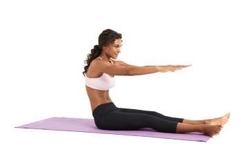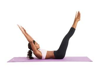 Лягте на спину, ноги согните в коленях под углом 90 градусов и поднимите над полом. Оторвите плечи от пола, вытяните руки перед собой вдоль бедер, ладони смотрят друг на друга (А). Вдохните, выдохните и вытяните ноги перед собой, одновременно поднимите руки над годовой, ладони разверните к ногам (Б). Вернитесь в исходное положение. Выполните 15 повторов.