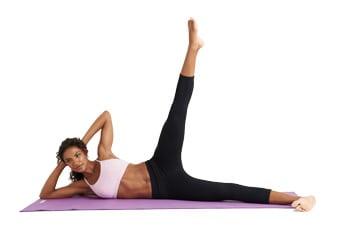 Лягте на правый бок, бедра разверните, ноги выпрямите, пятки, а также колени сомкнуты, стопы потяните от себя. Положите руки за голову, правый локоть уприте в пол. Выведите левую ногу, не сгибая в колене, вверх (А). Затем круговыми движениями (словно рисуете спираль) опустите перед собой (Б), а далее, продолжая круговые движения, выведите к опорной ноге и вновь поднимите, вернувшись в исходное положение. Выполните 10 повторов.