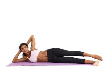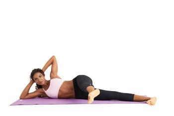Лягте на правый бок, бедра разверните, ноги выпрямите, пятки, а также колени сомкнуты, стопы потяните от себя. Положите руки за голову, правый локоть уприте в пол. Поднимите прямую левую ногу, затем опустите на пол, коснувшись мыском пола перед правой ступней (А), выполните 6 пульсирующих движений вверх-вниз с небольшой амплитудой. Вновь поднимите ногу и опустите, коснувшись мыском пола за правой ступней (Б), повторите 6 движений вверх-вниз. Повторяйте, уменьшая на каждом повторе количество движений на 1, пока не завершите подход.