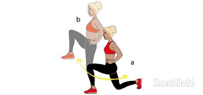 - Выпрямись обратно и сразу же подними правое колено к груди (b). Здесь тоже выдержи паузу, а затем опять опустись в выпад.