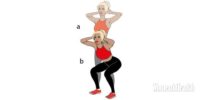 - Отводя таз назад и не опуская грудь, присядь на комфортную для тебя глубину (b).