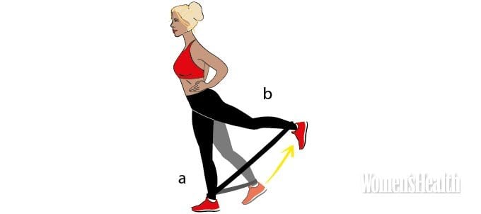 - Медленно отведи одну ногу назад как можно дальше (b), затем верни в исходное положение. (Можешь повысить интенсивность упражнения, надев амортизатор на лодыжки.)