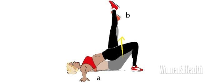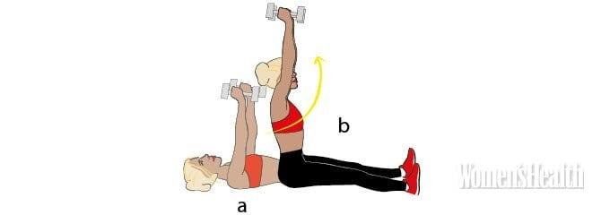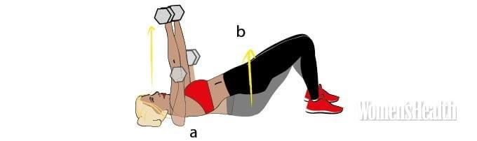 - Выжимая снаряды к потолку, одновременно подними таз (b). Задержись на несколько секунд, напрягая пресс (да, это больно). Затем опустись обратно.