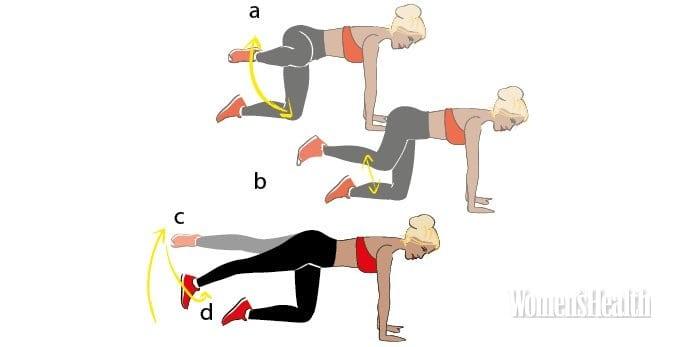 - Встань на четвереньки. Подними согнутую правую ногу в сторону до параллели с полом (a). Выдержи паузу и опусти обратно. Выполни 20 таких повторов.