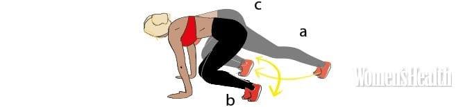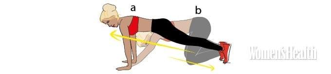 - Опустись, одновременно подтягивая правое колено к локтю (b). Вернись в исходное положение и поставь ногу обратно.