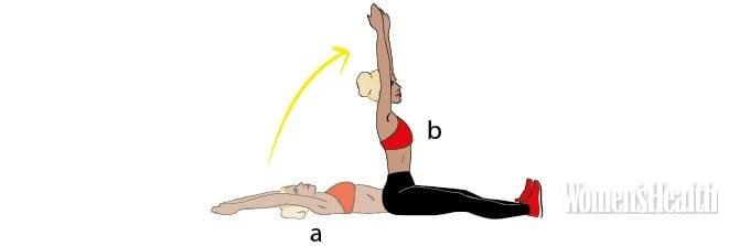 - Аккуратно оторви верх тела от пола и поднимись в положение сидя, тянись ладонями к потолку (b).