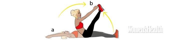 - Руками постарайся дотянуться до стоп (b). Задержись в этом положении на несколько секунд и опустись обратно.