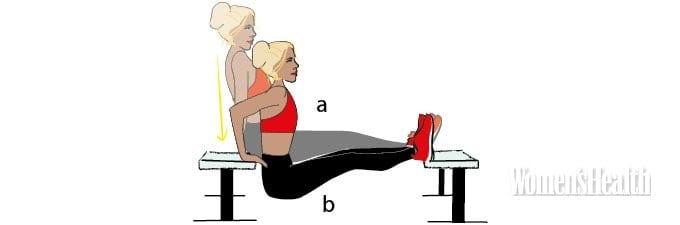 - Поставь рядом две скамьи или два стула (на расстоянии выпрямленных ног). На краешек одной присядь, уперевшись руками по бокам от корпуса; на другую помести пятки и лодыжки (a).