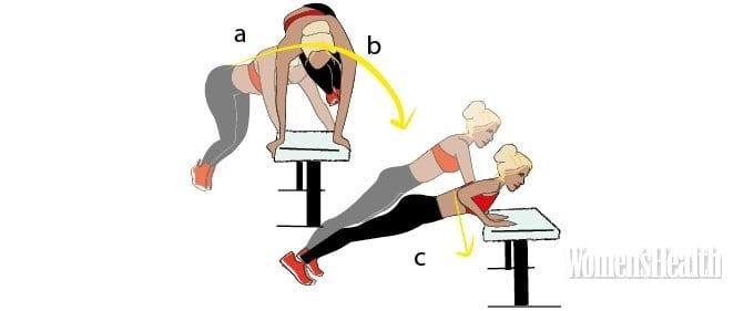 - Таким же прыжком вернись обратно. И медленно выполни отжимание от скамьи (c). Это один повтор.