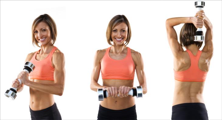 - Трицепс – французский жим, тяга на верхнем блоке, подъемы гантели, обратные отжимания от скамьи, разгибания с гантелями из-за головы и т.д.