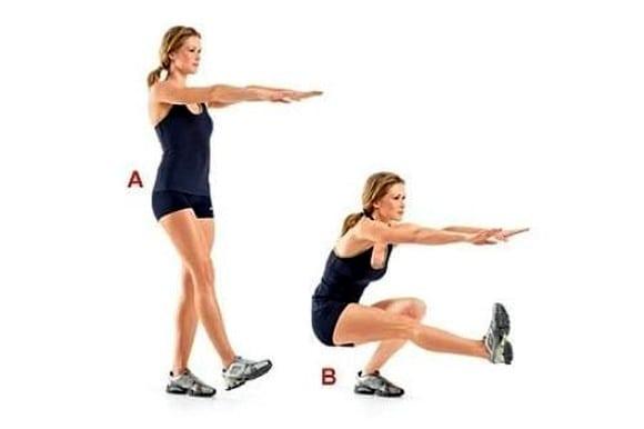 - Приседания. Приседать надо правильно. Ноги стоят на ширине плеч, руки на талии. Приседаем до положения, пока бедра не будут строго перпендикулярны туловищу. В крайней точке замираем на 1-2 секунды и выпрямляемся. Если вам слишком легко, можно взять в руки гантели весом до 2 кг.