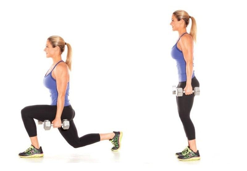 - Выпады. Обязательно включите в комплекс упражнений для избавления от ушек выпады. Станьте прямо, в руки возьмите небольшие гантели. Делаете шаг вперед и приседаете до того момента, пока бедро не будет параллельно полу. Затем возвращаемся в исходную позицию и повторяем движение для второй ноги. Отзывы свидетельствуют, что это упражнение прекрасно работает и воздействует не только на ушки, но и на заднюю поверхность бедра, голень, пресс.