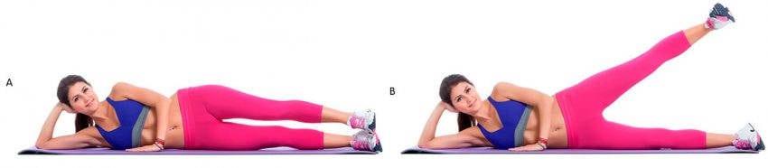 - Подъем ног на боку. Лягте на бок, и поднимайте свободную ногу максимально высоко. Движения должны быть плавными и спокойными.