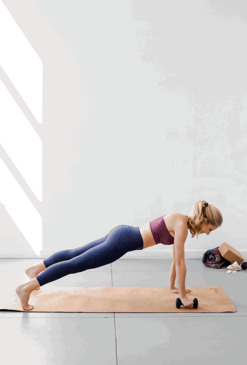 Встать в позу планки, упор одной рукой, вес в другой. 10 медленных отжиманий на выдохе с каждой стороны.